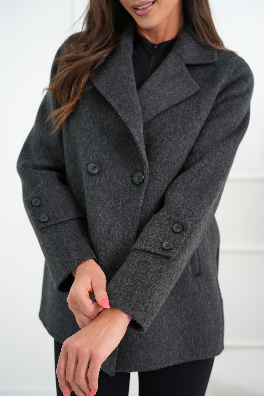 Kurtka wykonana z mieszanki wełny, zapinana na guziki. Długie rękawy z ozdobnym naszyciem, dwie boczne kieszenie. Kurtka bez podszewki.